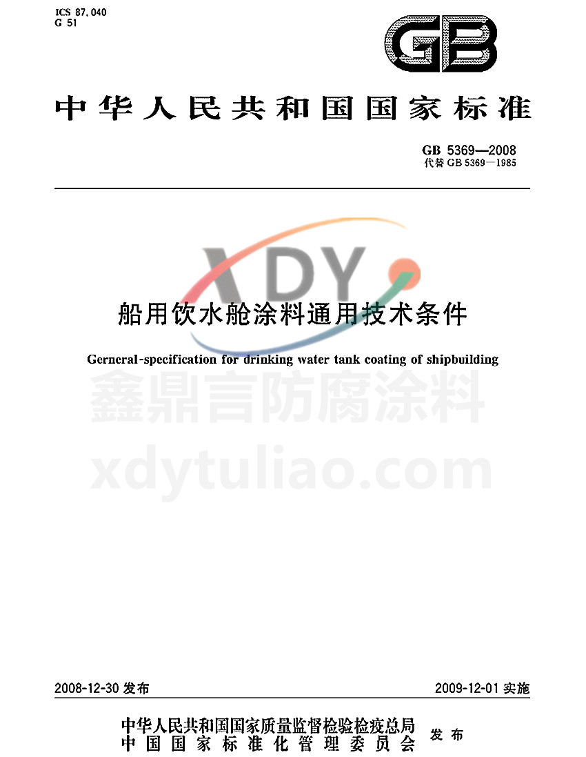 ICS87.040 G51 GB 中華人民共和國(guó)國(guó)家標(biāo)準(zhǔn) GB 5369-2008代替GB 5369-1985 船用飲水艙涂料通用技術(shù)條件 Gerneneral-specification for drinking wanter tank coating of shipbuilding 2008-12-30發(fā)布 2009-12-01實(shí)施 中華人民共和國(guó)國(guó)家質(zhì)量監(jiān)督檢驗(yàn)檢疫總局 中國(guó)國(guó)家標(biāo)準(zhǔn)化管理