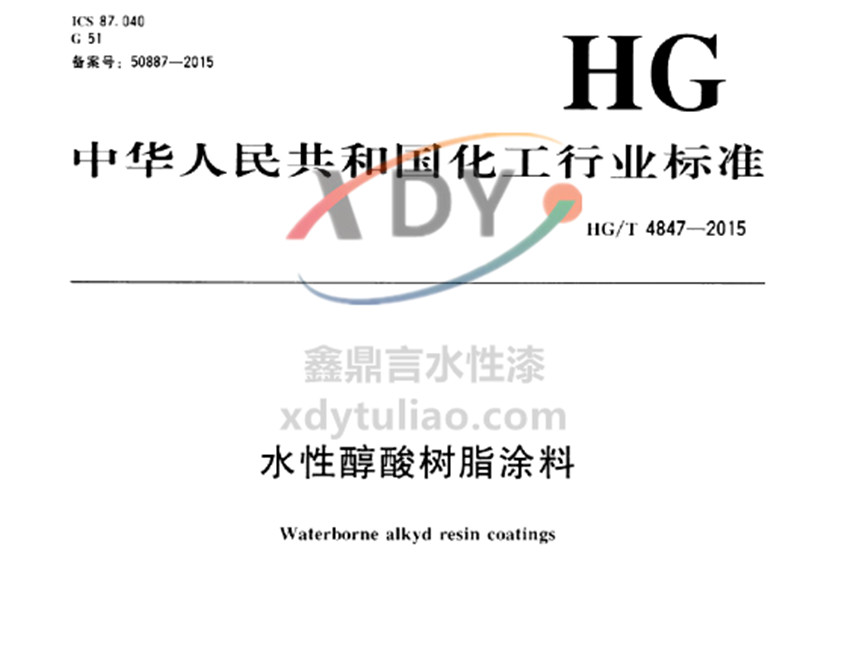 水性醇酸樹脂涂料化工行業(yè)標(biāo)準(zhǔn)HG/T4847-2015 備案號:50887-2015 中華人民共和國化工行業(yè)標(biāo)準(zhǔn) HG/T 4847-2015 水性醇酸樹脂涂料Waterborne alkyd resin coatings 2015-07-29發(fā)布 2016-01-01實施 中華人民共和國工業(yè)和信息化部 發(fā)布 本標(biāo)準(zhǔn)規(guī)定了水性醇酸樹脂涂料的要求,試驗方法,檢驗規(guī)則以及標(biāo)志、包裝和貯存。本標(biāo)準(zhǔn)適用