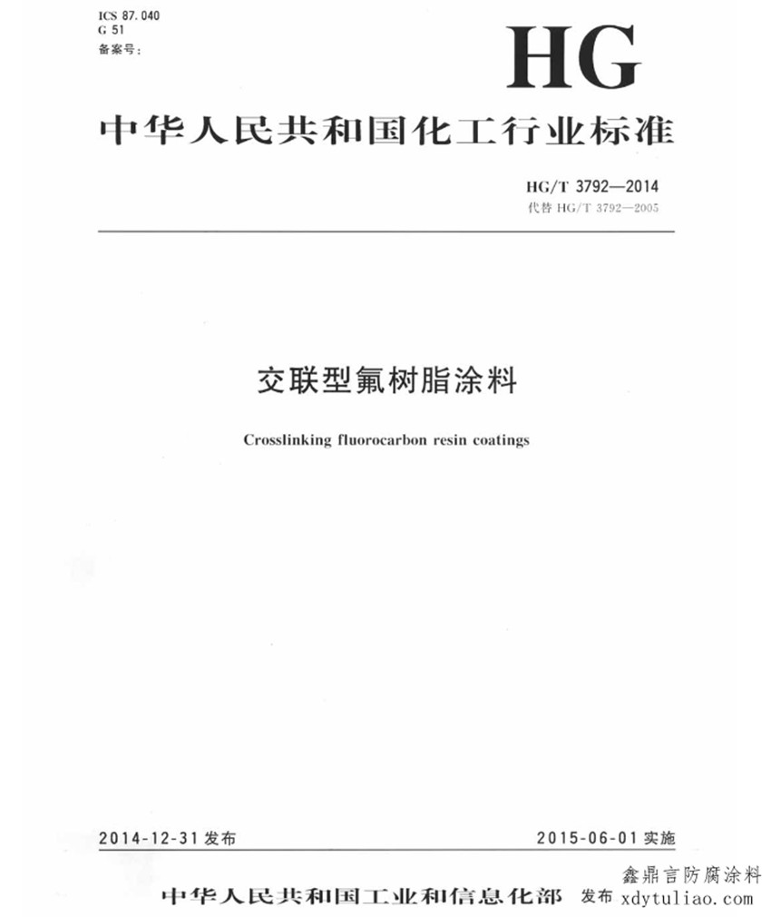 中華人民共和國化工行業標準HG/T3792-2014交聯型氟樹脂涂料替代HG/T3792-2005 本標準根據交聯型氟樹脂涂料的主要應用領域分為3種類:Ⅰ型為建筑外墻用氟樹脂涂料;Ⅱ型為橋梁、儲罐等混凝土設施表面用氟樹脂涂料;Ⅲ型為鋼結構等金屬表面用氟樹脂涂料。 常溫交聯型氟碳漆按化工行業標準HG/T3792-2014交聯型氟樹脂涂料執行,性能達到標準中的技術要求